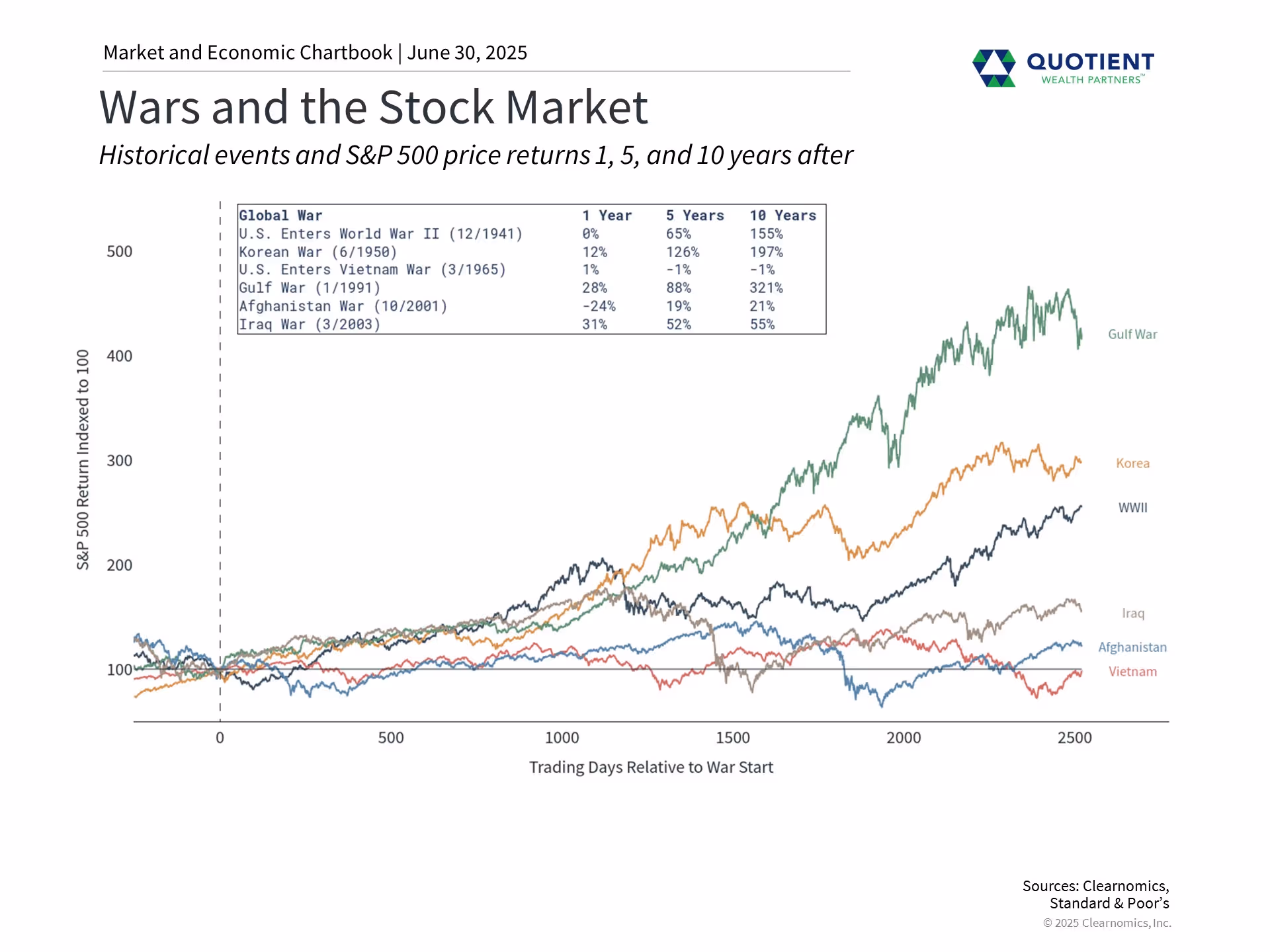 The news of such conflicts is heartbreaking from a human perspective, and our hearts go out to people caught in the fighting. From an investment perspective however, U.S. stocks have shown strong resilience during many past geopolitical events, including wars, as shown in the chart below.