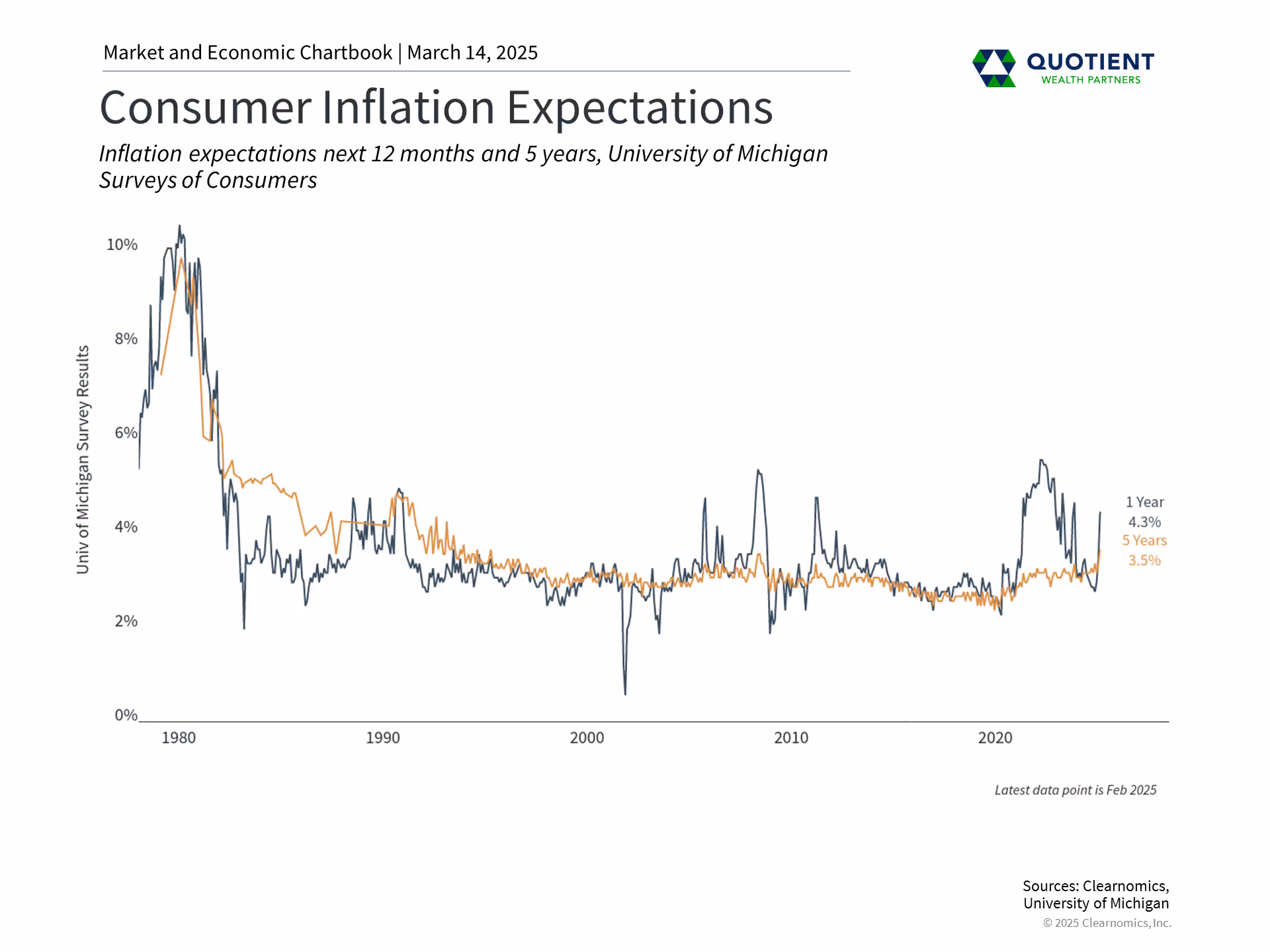 Inflation has rebounded with the Consumer Price Index climbing above 3.0% for the first time since last summer, while consumers now expect 3.5% inflation over the next five years—the highest level since 1995 according to University of Michigan data. This inflation outlook has contributed to widespread pessimism about future financial situations, creating a disconnect between consumer sentiment and market performance that investors must navigate carefully.